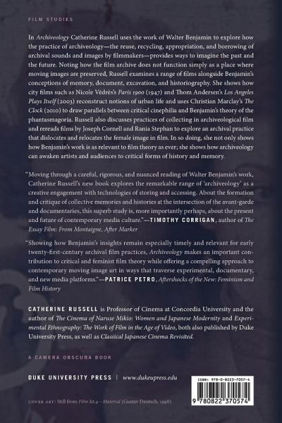 In Archiveology Catherine Russell uses the work of Walter Benjamin to explore how the practice of archiveology-the reuse, recycling, appropriation, and borrowing of archival sounds and images by filmmakers-provides ways to imagine the past and the future. Noting how the film archive does not function simply as a place where moving images are preserved, Russell examines a range of films alongside Benjamin's conceptions of memory, document, excavation, and historiography. She shows how city films such as Nicole Védrès's Paris 1900 (1947) and Thom Andersen's Los Angeles Plays Itself (2003) reconstruct notions of urban life and uses Christian Marclay's The Clock (2010) to draw parallels between critical cinephilia and Benjamin's theory of the phantasmagoria. Russell also discusses practices of collecting in archiveological film and rereads films by Joseph Cornell and Rania Stephan to explore an archival practice that dislocates and relocates the female image in film. In so doing, she not only shows how Benjamin's work is as relevant to film theory as ever; she shows how archiveology can awaken artists and audiences to critical forms of history and memory.