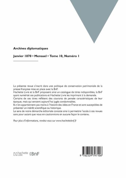 Archives diplomatiques: recueil de diplomatie et d'histoire Date de l'édition originale: 1870-01 La présente revue s'inscrit dans une politique de conservation patrimoniale de la presse française mise en place avec la BnF. Hachette Livre et la BnF proposent ainsi un catalogue de titres indisponibles, la BnF ayant numérisé ces publications et Hachette Livre les imprimant à la demande. Certains de ces titres reflètent des courants de pensée caractéristiques de leur époque, mais qui seraient aujourd'hui jugés condamnables. Ils n'en appartiennent pas moins à l'histoire des idées en France et sont susceptibles de présenter un intérêt scientifique ou historique. Le sens de notre démarche éditoriale consiste ainsi à permettre l'accès à ces revues sans pour autant que nous en cautionnions en aucune façon le contenu. Pour plus d'informations, rendez-vous sur www.hachettebnf.fr
