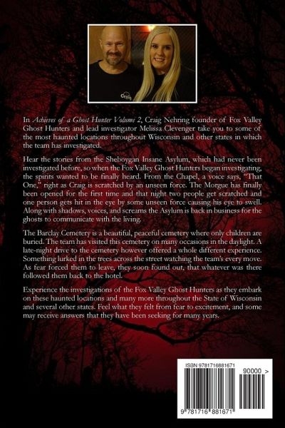 In Achieves of a Ghost Hunter Volume 2, Craig Nehring who is the founder of Fox Valley Ghost Hunters, and lead investigator Melissa Clevenger takes you to some of the most haunted locations throughout Wisconsin and other states in which the team has investigated. Embark on the investigations of the team from well-known haunted places such as the Sallie House in Atchison, Kansas; Randolph County Asylum in Winchester, Indiana; Mineral Springs Hotel in Alton, Illinois; and Summerwind in Land O' Lakes, Wisconsin. Also included in the book are chilling stories of haunted locations that are not as familiar, such as, Groppi's in Bay View, Wisconsin or The Preston Residence in Marquette, Kansas. Hear the stories from The Sheboygan Insane Asylum, which had never been investigated before, so when the Fox Valley Ghost Hunters began investigating, the spirits wanted to be finally heard. From the Chapel, a voice says, "That One," right as Craig is scratched by an unseen force. Disembodied voices, slamming doors and shadow people are only the beginning of what the team has experienced at the Asylum. The Barclay Cemetery is a beautiful, peaceful cemetery where only children are buried. The team has visited this cemetery on many occasions in the daylight. A late-night drive to the cemetery however offered a whole different experience. Something lurked in the trees across the street watching the teams every move. As fear forced them to leave, they soon found out, that whatever was there followed them back to the hotel. Experience the investigations of the Fox Valley Ghost Hunters as they journey inside these haunted places and show you what it is like to be a ghost hunter. Feel what they felt from fear to excitement, and some may receive answers that they have been seeking for many years.