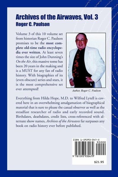 This 10 volume set from historian Roger C. Paulson promises to be the Most Complete OTR encyclopedia ever written. At least seven times the size of John Dunning's On the Air, this massive tome has been 20 years in the making and is a MUST for any fan of radio. Biographies of its (even obscure) series and stars, it is the most comprehensive set ever attempted! Everything from A&P Bandwagon to Ivan Cury is covered in Volume 1 in an overwhelming amalgamation of biographical material that is sure to please the casual observer as well as the steadfast researcher of radio and early recorded sound. Birthdates, deathdates, credit lists, cross-referenced with alternate show names, Archives of the Airwaves far surpasses any book on radio history ever before published. ROGER C. PAULSON began his passion for radio during the 1940's with his juvenile ear glued to the loudspeaker. In 1946, while on a trip to New York City with his parents, he became very excited to actually see live broadcasts of shows he had often heard over the air. All of this eventually led to his forty year career in broadcasting. During the 1970's he began collecting tapes and books on old-time radio. After listening to the tapes and reading the books he decided to author a complete, accurate and readable encyclopedia on OTR he titled Archives of the Airwaves. Some twenty years later, upon completing the time-consuming research and writing, you are now reading the result.