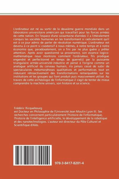 L'ordinateur est né au sortir de la deuxième guerre mondiale dans un laboratoire universitaire américain qui travaillait pour les forces armées de cette nation. En l'espace d'une soixantaine d'années il a littéralement conquis les sociétés humaines en les transformant si radicalement qu'il est à ce jour admis de parler de révolution numérique. L'ordinateur est devenu à ce point si coextensif à nous-mêmes, à notre temps et à notre économie que, paradoxalement, on a fini par ne plus guère y prêter attention. Après avoir questionné sa provenance, son essence logico-mathématique nous montrons comment l'ordinateur, fils prodigue engendré et perfectionné en temps de guerre(s) par la puissante triangulaire armée-université-industrie et pensé à l'origine comme un analogue artificiel du cerveau humain, n'a jamais cessé de subir de spectaculaires métamorphoses qualitatives et performatives tout en induisant rétroactivement des transformations remarquables sur les institutions et les groupes qui l'ont produit puis massivement utilisé. Au travers de cette archéologie de l'informatique il s'agit de tenter de mieux comprendre la machine univers, son histoire et sa science.