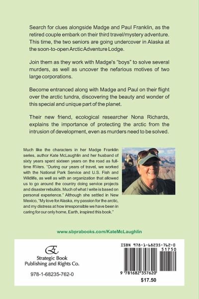 Search for clues alongside Madge and Paul Franklin, as the retired couple embark on their third travel/mystery adventure. This time, the two seniors are going undercover in Alaska at the soon-to-open Arctic Adventure Lodge. Join them as they work with Madge's "boys" to solve several murders, as well as uncover the nefarious motives of two large corporations. Become entranced along with Madge and Paul on their flight over the arctic tundra, discovering the beauty and wonder of this special and unique part of the planet. Their new friend, ecological researcher Nona Richards, explains the importance of protecting the arctic from the intrusion of development, even as murders need to be solved. (About the Author) Much like the characters in her Madge Franklin series, author Kate McLaughlin and her husband of sixty years spent sixteen years on the road as full-time RVers. "During our years of travel, we worked with the National Park Service and U.S. Fish and Wildlife, as well as with an organization that allowed us to go around the country doing service projects and disaster rebuilds. Much of what I write is based on personal experience." Although she settled in New Mexico, "My love for Alaska, my passion for the arctic, and my distress at how irresponsible we have been in caring for our only home, Earth, inspired this book."