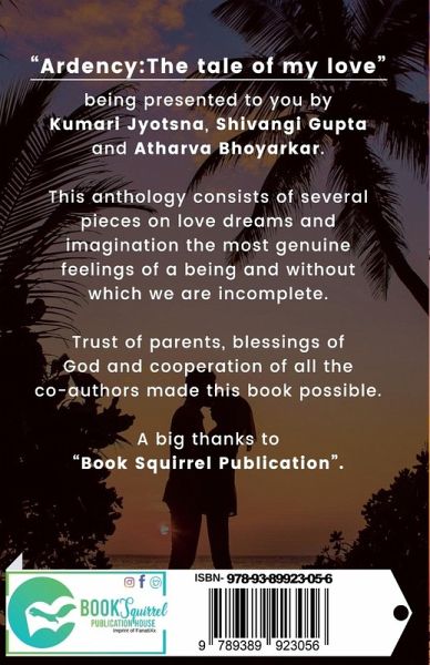 Ardency:The tale of my love,being presented to you by Kumari Jyotsna, Shivangi Gupta and Atharva Bhoyarkar. This anthology consists of several pieces on love dreams and imagination,the most genuine feelings of a being and without which we are incomplete. Trust of parents, blessings of God and cooperation of all the co-authors made this book possible. A big thanks to Book Squirrel Publication.