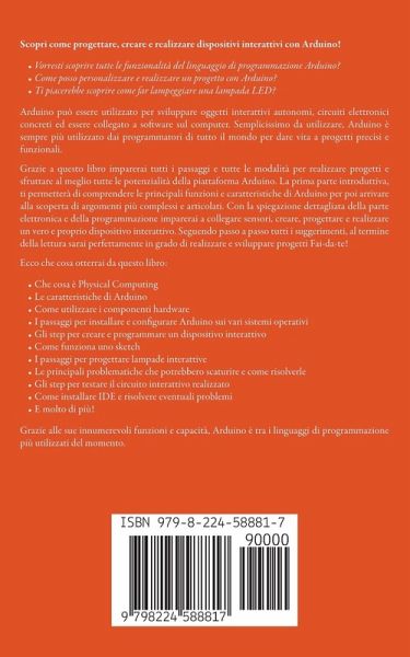 Scopri come progettare, creare e realizzare dispositivi interattivi con Arduino!Vorresti scoprire tutte le funzionalità del linguaggio di programmazione Arduino? Come posso personalizzare e realizzare un progetto con Arduino? Ti piacerebbe scoprire come far lampeggiare una lampada LED? Arduino può essere utilizzato per sviluppare oggetti interattivi autonomi, circuiti elettronici concreti ed essere collegato a software sul computer. Semplicissimo da utilizzare, Arduino è sempre più utilizzato dai programmatori di tutto il mondo per dare vita a progetti precisi e funzionali. Grazie a questo libro imparerai tutti i passaggi e tutte le modalità per realizzare progetti e sfruttare al meglio tutte le potenzialità della piattaforma Arduino. La prima parte introduttiva, ti permetterà di comprendere le principali funzioni e caratteristiche di Arduino per poi arrivare alla scoperta di argomenti più complessi e articolati. Con la spiegazione dettagliata della parte elettronica e della programmazione imparerai a collegare sensori, creare, progettare e realizzare un vero e proprio dispositivo interattivo. Seguendo passo a passo tutti i suggerimenti, al termine della lettura sarai perfettamente in grado di realizzare e sviluppare progetti Fai-da-te! Ecco che cosa otterrai da questo libro:Che cosa è Physical Computing Le caratteristiche di Arduino Come utilizzare i componenti hardware I passaggi per installare e configurare Arduino sui vari sistemi operativi Gli step per creare e programmare un dispositivo interattivo Come funziona uno sketch I passaggi per progettare lampade interattive Le principali problematiche che potrebbero scaturire e come risolverle Gli step per testare il circuito interattivo realizzato Come installare IDE e risolvere eventuali problemi E molto di più! Grazie alle sue innumerevoli funzioni e capacità, Arduino è tra i linguaggi di programmazione più utilizzati del momento.