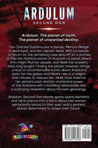 Ardulum. The planet of myth. The planet of unwanted destiny. The Charted Systems are in pieces. Mercy's Pledge is destroyed, and her captain dead. With no homes to return to, the remaining crew sets off on a journey to find the mythical planet of Ardulum-a planet where Emn might find her people, and Neek the answers she's long sought. Finding the planet, however, brings a host of uncomfortable truths about Ardulum's vision for the galaxy and Neek's role in a religion that refuses to release her. Neek must balance her planet's past and the unchecked power of the Ardulans with a budding relationship and a surprising revelation about her own genealogy. Ardulum: Second Don blends space opera elements and hard science into a story about two women persistently bound to their past and a sentient planet determined to shape their future.