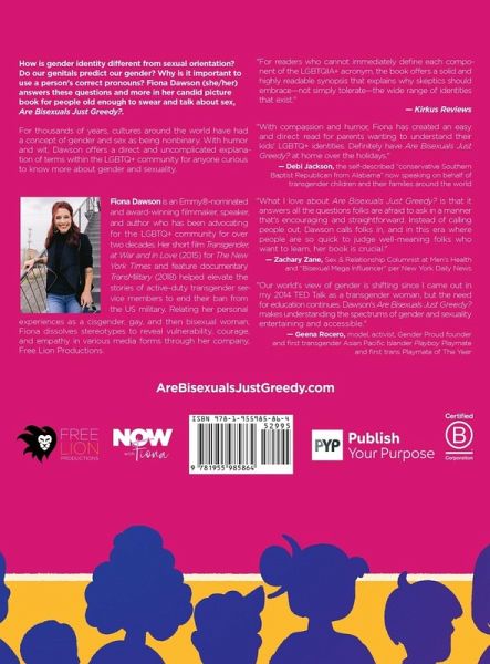 Amazon #1 Bestseller in: Gay Studies Transgender Studies Men, Women, & Relationships Humor LGBTQ+ Parenting & Families ¿ How is gender identity different from sexual orientation? Do our genitals predict our gender? Why is it important to use a person's correct pronouns? Fiona Dawson (she/her) answers these questions and more in her candid picture book for people old enough to swear and talk about sex, Are Bisexuals Just Greedy?. For thousands of years, cultures around the world have had a concept of gender and sex as being nonbinary. With humor and wit, Dawson offers a direct and uncomplicated explanation of terms within the LGBTQ+ community for anyone curious to know more about gender and sexuality.