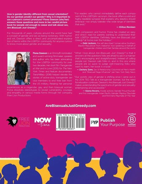 Amazon #1 Bestseller in: Gay Studies Transgender Studies Men, Women, & Relationships Humor LGBTQ+ Parenting & Families How is gender identity different from sexual orientation? Do our genitals predict our gender? Why is it important to use a person's correct pronouns? Fiona Dawson (she/her) answers these questions and more in her candid picture book for people old enough to swear and talk about sex, Are Bisexuals Just Greedy?. For thousands of years, cultures around the world have had a concept of gender and sex as being nonbinary. With humor and wit, Dawson offers a direct and uncomplicated explanation of terms within the LGBTQ+ community for anyone curious to know more about gender and sexuality.