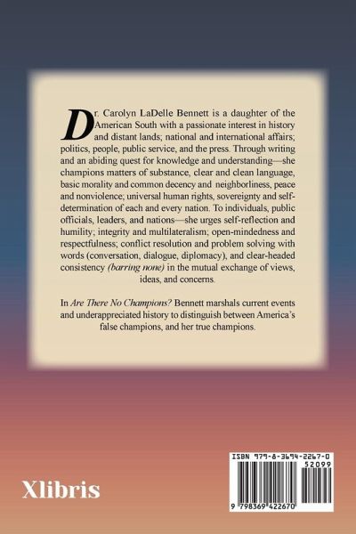 Are there no Champions - Yes and No a work in politics, public affairs, and the press exploring and contrasting acts of aggression (patriots for hire) characteristic of decorated false "champions" in the contemporary era; and acts of peace and life-risking courage of true champions (mainly women) two centuries earlier.