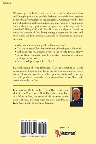 Written by a biblical scholar and church elder, this ambitious and thought-provoking guide is designed to examine and explore beliefs that are prevalent in the evangelical Christian world today. New churches and denominations are emerging at a rapid pace, but are these congregations worshipping God in the way that He intended? Using Old and New Testament scripture, Dorricott traces the concept of God living among a people on the earth and shows how the Bible provides answers to fundamental questions such as: Why are there so many Christian churches? Can we be true Christians without belonging to a church? Is the apostles' teaching relevant in the twenty-first century? Is the New Testament just first-century history, or is it also a blueprint for us? Is all worship acceptable to God? By challenging all true followers of Jesus Christ to set aside conventional thinking and focus on the true meaning of God's house, Dorricott provides a path of genuine study and reflection that will guide all those who wish to examine and reaffirm their service in unity to God.
