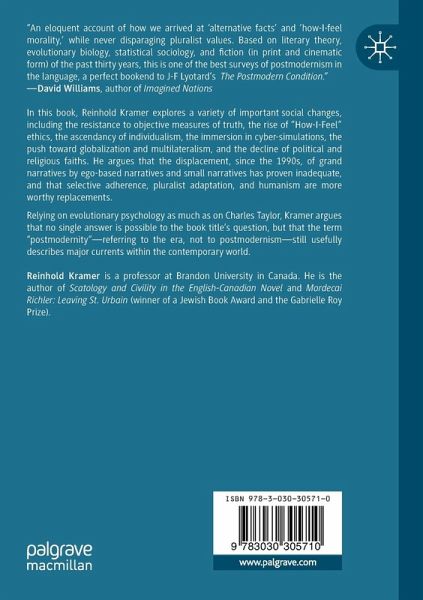 In this book, Reinhold Kramer explores a variety of important social changes, including the resistance to objective measures of truth, the rise of "How-I-Feel" ethics, the ascendancy of individualism, the immersion in cyber-simulations, the push toward globalization and multilateralism, and the decline of political and religious faiths. He argues that the displacement, since the 1990s, of grand narratives by ego-based narratives and small narratives has proven inadequate, and that selective adherence, pluralist adaptation, and humanism are more worthy replacements. Relying on evolutionary psychology as much as on Charles Taylor, Kramer argues that no single answer is possible to the book title's question, but that the term "postmodernity" - referring to the era, not to postmodernism - still usefully describes major currents within the contemporary world.