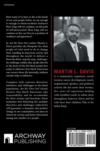How many of us have to die at the hands of our own people before we say enough is enough to black-on-black violence? How long will we continue on this path of self-destruction? How long will we continue to live our lives in a position of weakness and ignorance? In Are We There Yet?, author Martin L. Davis provides the blueprint for what people of color need to do to change their standing in American society and throughout the world. It delivers a blow-by-blow, step-by-step, challenge-by-challenge outline that speaks directly to the heart of the ills black people face today. It addresses how black Americans can correct those ills internally, without outside help or influence. Complete with concrete directives, initiatives, and challenges to the black population, Are We There Yet? clearly dictates that black Americans take responsibility and be accountable for their actions and inactions. Davis maintains that following the multiple directives and challenges collectively will guarantee a dramatic and positive change in our communities, our place in American society, and better interaction among one another as a people.