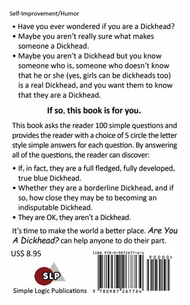 There are a lot of Dickheads in the world. They sometimes sit next to you on the bus, train, subway or plane. Your boss or co-worker might be a Dickhead. Your neighbor could be a Dickhead. And heaven forbid that your girlfriend, boyfriend, husband, wife or your lover is a Dickhead. Maybe you have wondered if you are a Dickhead? Or maybe you know that you aren't a Dickhead but you know someone who is, someone who doesn't know that he or she (yes, girls can be dickheads too) is a real Dickhead and you want that person to know that he or she is a Dickhead. If so, this book is for you. This book, Are You A Dickhead?, asks the reader 100 simple questions and provides the reader with a choice of 5 circle the letter style simple answers. By answering all of the questions, the reader can create a DH Score. This enables the reader to determine whether he or she is: A Dickhead. Close to being a Dickhead, and if so, how close to becoming an indisputable Dickhead. Isn't a Dickhead. Are You A Dickhead? takes a humorous but also educational look at manners and lack of manners. It looks at things that people do and don't do in Public, when Getting Around, in Relationships, and in their Brain that make them Dickheads. For example: Question 1 When in public‚ do you: Pick your nose and look at what you picked. Pick your nose and flick whatever you picked out into the air. Pick your nose only when you know for sure that no one is looking or watching. Pick your nose and eat what you have picked out. Pick your nose and put what you picked out into your pocket to eat later. Question 78 When you use a friend's toilet‚ do you: Not flush, thus leaving your pee or poop in the toilet when you leave. Pee, poop and flush. Flush a sock or hand towel down the toilet so that the next time your friend uses his or her toilet, it will overflow. You like to play jokes on your friends. Leave poop marks on the inside of the toilet bowl. Intentionally pee on the toilet seat and laugh as you do. No doubt the world would be a nicer place to live if there were fewer Dickheads. Answering the 100 questions in this book will enable the reader to do their part, to discover things that they need to improve in themselves, their manners - to help make the world a better place for us all.