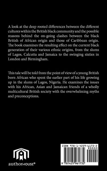 A look at the deep rooted differences between the different cultures within the British black community and the possible reasons behind the on-going clashes between the black British of African origin and those of Caribbean origin. The book examines the resulting effect on the current black generation of their various ethnic origins, from the slums of Lagos, Calcutta and Jamaica to the swinging sixties in London and Birmingham. This tale will be told from the point of view of a young British born African who spent the earlier part of his life growing up in the slums of Lagos, Nigeria. He examines the issues with his African, Asian and Jamaican friends of a wholly multicultural British society with the overwhelming myths and preconceptions.
