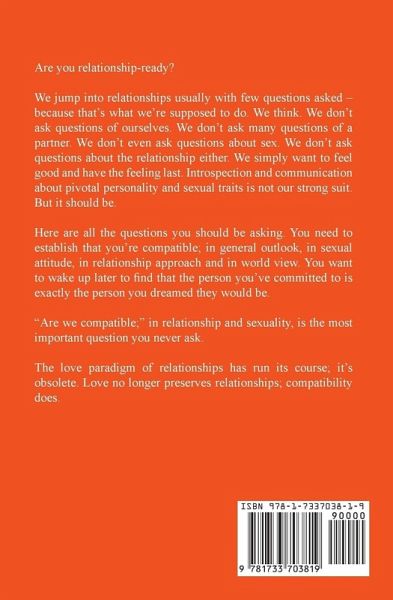 The love paradigm of relationships has run its course; it's obsolete. Our parents stayed together from a sense of duty. Their parents coupled from need. We chose infatuation and love. Love no longer preserves relationships if you're not compatible. The book explores how and why relationships fail. Traditionally we've relied on infatuation and emotion and hoped for the best. This book offers tools, questions, discussions and examples which demonstrate that without compatibility relationships will not cultivate enough substance to sustain. If you've been through three failed relationships and one unpleasant divorce you have first hand experience of the emotional turmoil, anguish and agony of all the unanswered questions as to what went wrong, am I not good enough and what could I have done differently when the only question which matters is, "Were we compatible?" Partners must first know who they are in order to recognize the qualities of a potential partner; then find their "sovereign voices" to address each other with anchored respect, unflinching honesty, unending exploration and depth. We owe it to each other to remain interesting, suspend the superficial and replace frivolous entertainment with experiential development of our personal and sexual selves. The advent of reproductive choice, equal access to education and employment opportunity has brought the Cinderella story to a natural close. We must view and respect each other as equals as we seek to encourage the best of each other's intellect and emotion to form more fulfilling relationships. This book is the first word in relationship compatibility and invites us to hold each other accountable to a higher standard for entering and preserving our relationship. More than love, more than education, more than communication, more than money; Compatibility is everything.