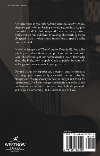 Are there voids in your life nothing seems to satisfy? Do you often feel guilty for not having a rewarding, productive, quiet time with God? In this fast-paced, materialistically driven world, women find it difficult to accomplish everything they're obligated to do. It often seems impossible to spend quality time with God. In Are You Hungry and Thirsty?, author Donnie Warford offers simple practical solutions to find precious time to spend with God. She offers insight into how to develop "heart" knowledge about the Bible, how to apply God's principles in your life, and suggests resources to help you get started. Donnie shares her experiences, thoughts, and scriptures to encourage you in your daily walk with the Lord. Are You Hungry and Thirsty? shows you how to hunger and thirst for righteousness. She helps you get your priorities in order so you can have sufficient time to do everything God calls you to do and enjoy the rewarding life He intends you to have.