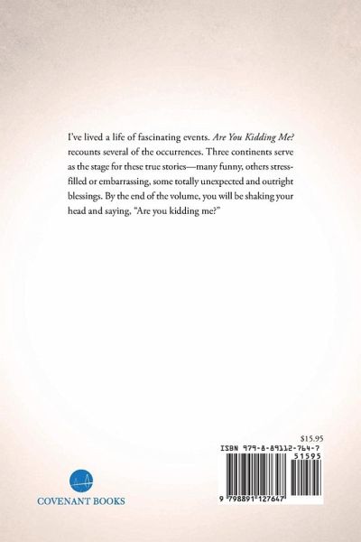 I've lived a life of fascinating events. Are You Kidding Me? recounts several of the occurrences. Three continents serve as the stage for these true stories--many funny, others stress-filled or embarrassing, some totally unexpected and outright blessings. By the end of the volume, you will be shaking your head and saying, "Are you kidding me?"