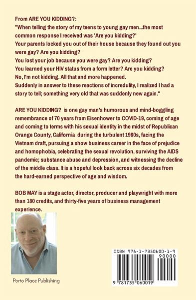 From "ARE YOU KIDDING?":"When telling the story of my teens to young gay men...the most common response I received was 'Are you kidding? 'Your parents locked you out of their house because they found out you were gay? Are you kidding? You lost your job because you were gay? Are you kidding? You learned your HIV status from a form letter? Are you kidding? No, I'm not kidding. All that and more happened. Suddenly in answer to these reactions of incredulity, I realized I had a story to tell; something very old that was suddenly new again. "ARE YOU KIDDING? is one gay man's humorous and mind-boggling remembrance of 70 years from Eisenhower to COVID-19, coming of age and coming to terms with his sexual identity, living in Republican Orange County, facing the Vietnam draft, pursuing a show business career in the face of prejudice and homophobia, celebrating the sexual revolution, surviving the AIDS pandemic; substance abuse and depression, and witnessing the decline of the middle class. It is a hopeful look back across six decades from the hard-earned perspective of age and wisdom.