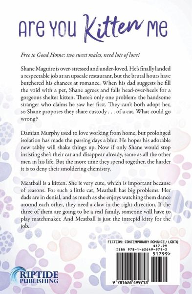 Free to Good Home: two sweet males, need lots of love! Shane Maguire is over-stressed and under-loved. He's finally landed a respectable job at an upscale restaurant, but the brutal hours have butchered his chances at romance. When his dad suggests he fill the void with a pet, Shane agrees and falls head-over-heels for a gorgeous shelter kitten. There's only one problem: the handsome stranger who claims he saw her first. They can't both adopt her, so Shane proposes they share custody . . . of a cat. What could go wrong? Damian Murphy used to love working from home, but prolonged isolation has made the passing days a blur. He hopes his adorable new tabby will shake things up. Now if only Shane would stop insisting she's their cat and disappear already, same as all the other men in his life. But the more time they spend together, the harder it is to deny their smoldering chemistry. Meatball is a kitten. She is very cute, which is important because of reasons. For such a little cat, Meatball has big problems. Her dads are in denial, and as much as she enjoys watching them dance around each other, they need a claw in the right direction. If the three of them are going to be a real family, someone will have to play matchmaker. And Meatball is just the intrepid kitty for the job.