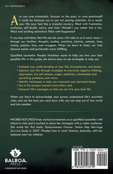 Are you over-scheduled, focused on the past, or over-emotional? It could be because you're just not paying attention. As a result, your life may feel like a stressful mystery, filled with frustration, confusion, self-doubt, worry, and fear. Wouldn't you rather live a funfilled and exciting adventure filled with happiness? If you stop and listen, that life can be yours. Life talks to us in many ways-through our intuition, thoughts, bodies, emotions, instincts, animals, time, money, passion, love, and struggles. When we learn to listen, our lives become easier and profoundly more fulfilling. Qualified counsellor Phoebe Hutchison wants to help you live your best possible life. In this guide, she shares easy-to-use strategies to help you ¿ increase your understanding of your life, circumstances, and issues; ¿ improve your life through strategies to overcome negative thinking, depression, low self-esteem, anger, addiction, relationship and parenting problems, and more; ¿ identify techniques to help you transcend your personal issues; ¿ live in the present moment more often; and ¿ interpret life's messages so that you can live your best life. When you learn to acknowledge your power, understand life's unwritten rules, and use the tools you were born with, you can step out of one world and into another.