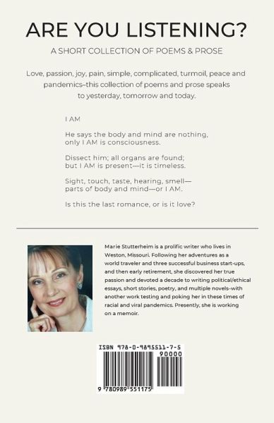 ARE YOU LISTENING? A SHORT COLLECTION OF POEMS & PROSE Love, passion, joy, pain, simple, complicated, turmoil, peace and pandemics-this collection of poems and prose speaks to yesterday, tomorrow and today. I AM He says the body and mind are nothing, only I AM is consciousness. Dissect him; all organs are found; but I AM is present-it is timeless. Sight, touch, taste, hearing, smell- parts of body and mind-or I AM. Is this the last romance, or is it love?