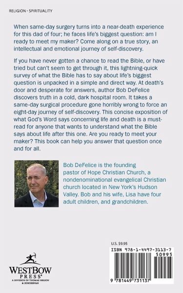 When same-day surgery turns into a near-death experience for this dad of four; he faces life's biggest question: am I ready to meet my maker? Come along on a true story, an intellectual and emotional journey of self-discovery. If you have never gotten a chance to read the Bible, or have tried but can't seem to get through it, this lightning-quick survey of what the Bible has to say about life's biggest question is unpacked in a simple and direct way. At death's door and desperate for answers, author Bob DeFelice discovers truth in a cold, dark hospital room. It takes a same-day surgical procedure gone horribly wrong to force an eight-day journey of self-discovery. This concise exposition of what God's Word says concerning life and death is a must-read for anyone that wants to understand what the Bible says about life after this one. Are you ready to meet your maker? This book can help you answer that question once and for all.
