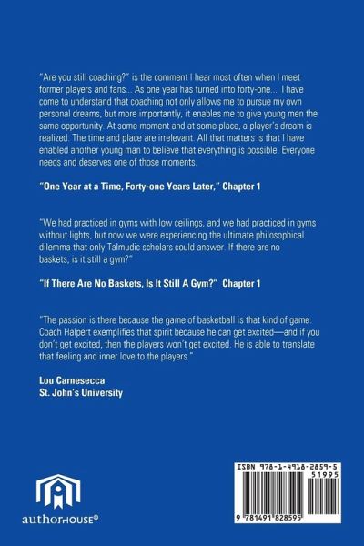 "The nine members of the 1975-1976 Yeshiva University varsity basketball team attended their Jewish studies classes from nine to one, their secular classes from two to seven, practiced until ten, and went on to become doctors, dentists, or lawyers. The 1975 team's daily schedule and accomplishments were not unique, but rather representative of the approximately six hundred players who for eighty-three years have worn the Yeshiva University blue and white uniform. . . " "Why They Played," Chapter 11? The stories and observations that follow describe what happens when Yeshiva players attempt to find time for everything: Torah study, secular knowledge, and athletic triumph. When Dr. Halpert scours the globe for good player-athletes who will lead the team to victory, he looks for athletic promise, but in searching for the best, he is cognizant that, in the final analysis, his team will be the YU team. He knows that the players must be the best-but also informed by values, Jewish values, universal values, and values touched by the breath of Torah. Rabbi Simcha Krauss Rabbi Emeritus Young Israel of Hillcrest "The passion is there because the game of basketball is that kind of game. Coach Halpert exemplifies that spirit because he can get excited-and if you don't get excited, then the players won't get excited. He is able to translate that feeling and inner love to the players." Lou Carnesecca St. John's University