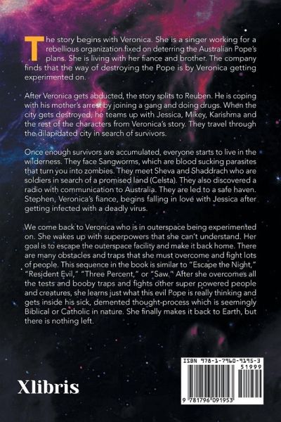 The story begins with Veronica. She is a singer working for a rebellious organization fixed on deterring the Australian Pope's plans. She is living with her fiance and brother. The company finds that the way of destroying the Pope is by Veronica getting experimented on. After Veronica gets abducted, the story splits to Reuben. He is coping with his mother's arrest by joining a gang and doing drugs. When the city gets destroyed, he teams up with Jessica, Mikey, Karishma and the rest of the characters from Veronica's story. They travel through the dilapidated city in search of survivors. Once enough survivors are accumulated, everyone starts to live in the wilderness. They face Sangworms, which are blood sucking parasites that turn you into zombies. They meet Sheva and Shaddrach who are soldiers in search of a promised land (Celsta). They also discovered a radio with communication to Australia. They are led to a safe haven. Stephen, Veronica's fiance, begins falling in love with Jessica after getting infected with a deadly virus. We come back to Veronica who is in outerspace being experimented on. She wakes up with superpowers that she can't understand. Her goal is to escape the outerspace facility and make it back home. There are many obstacles and traps that she must overcome and fight lots of people. This sequence in the book is similar to "Escape the Night," "Resident Evil," "Three Percent," or "Saw." After she overcomes all the tests and booby traps and fights other super powered people and creatures, she learns just what this evil Pope is really thinking and gets inside his sick, demented thought-process which is seemingly Biblical or Catholic in nature. She finally makes it back to Earth, but there is nothing left.