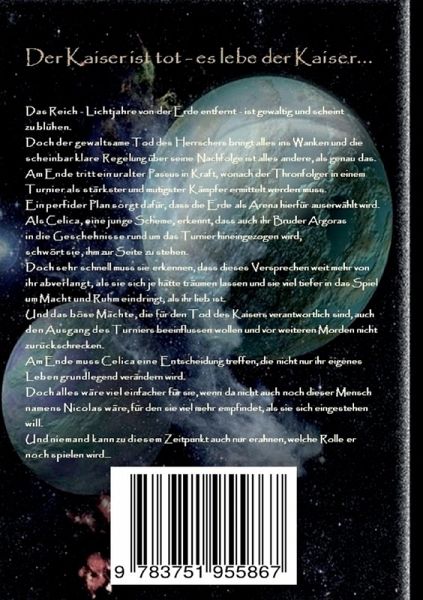 Der Kaiser ist tot - es lebe der Kaiser...Das Reich - Lichtjahre von der Erde entfernt - ist gewaltig und scheint zu blühen.Doch der gewaltsame Tod des Herrschers bringt alles ins Wanken.Und die scheinbar klare Regelung über seine Nachfolge ist alles andere als genau das.Am Ende tritt ein uralter Passus in Kraft, wonach der Thronfolger in einem Turnier als stärkster und mutigster Kämpfer ermittelt werden muss.Ein perfider und heimtückischer Plan sorgt dafür, dass die Erde als Arena hierfür auserwählt wird.Als Celica, eine junge Scheme, erkennt, dass auch ihr Bruder Argoras in die Geschehnisse rund um das Turnier hineingezogen wird, schwört sie, ihm zur Seite zu stehen.Doch sehr schnell muss sie erkennen, dass dieses Versprechen weit mehr von ihr abverlangt, als sie sich je hätte träumen lassen und sie viel tiefer in das Spiel um Macht und Reichtum eindringt, als ihr lieb ist.Und das die bösen Mächte, die für den Tod des Kaisers verantwortlich sind, auch den Ausgang des Turniers beeinflussen wollen und vor weiteren Morden nicht zurückschrecken.Am Ende muss Celica eine Entscheidung treffen, die nicht nur ihr eigenes Leben grundlegend verändern wird.Doch alles wäre viel einfacher für sie, wenn da nicht auch noch dieser Mensch namens Nicolas wäre, für den sie viel mehr empfindet, als sie sich eingestehen will.Und niemand kann zu diesem Zeitpunkt auch nur erahnen, welche Rolle er noch spielen wird...
