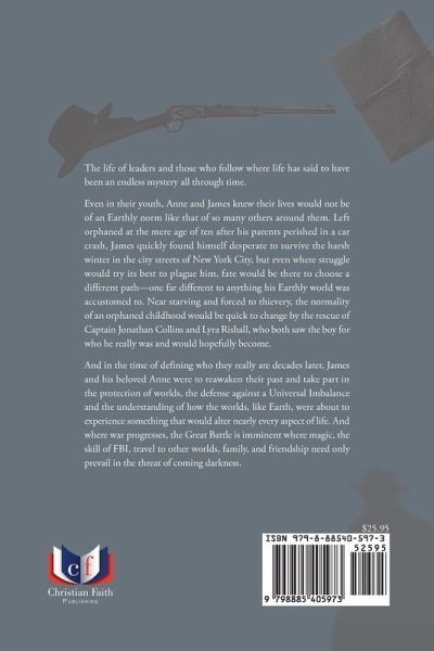 The life of leaders and those who follow where life has said to have been an endless mystery all through time. Even in their youth, Anne and James knew their lives would not be of an Earthly norm like that of so many others around them. Left orphaned at the mere age of ten after his parents perished in a car crash, James quickly found himself desperate to survive the harsh winter in the city streets of New York City, but even where struggle would try its best to plague him, fate would be there to choose a different path--one far different to anything his Earthly world was accustomed to. Near starving and forced to thievery, the normality of an orphaned childhood would be quick to change by the rescue of Captain Jonathan Collins and Lyra Rishall, who both saw the boy for who he really was and would hopefully become. And in the time of defining who they really are decades later, James and his beloved Anne were to reawaken their past and take part in the protection of worlds, the defense against a Universal Imbalance and the understanding of how the worlds, like Earth, were about to experience something that would alter nearly every aspect of life. And where war progresses, the Great Battle is imminent where magic, the skill of FBI, travel to other worlds, family, and friendship need only prevail in the threat of coming darkness. 2