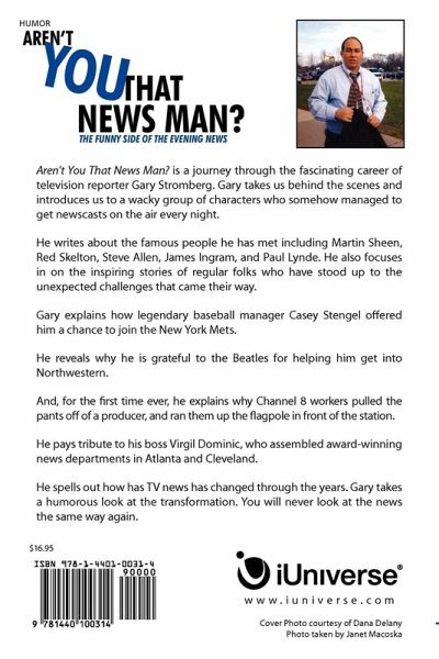 Aren't You That News Man? is a journey through the fascinating career of television reporter Gary Stromberg. Gary takes us behind the scenes and introduces us to a wacky group of characters who somehow managed to get newscasts on the air every night. He writes about the famous people he has met including Martin Sheen, Red Skelton, Steve Allen, James Ingram, and Paul Lynde. He also focuses in on the inspiring stories of regular folks who have stood up to the unexpected challenges that came their way. Gary explains how legendary baseball manager Casey Stengel offered him a chance to join the New York Mets. He reveals why he is grateful to the Beatles for helping him get into Northwestern. And, for the first time ever, he explains why Channel 8 workers pulled the pants off of a producer, and ran them up the flagpole in front of the station. He pays tribute to his boss Virgil Dominic, who assembled award-winning news departments in Atlanta and Cleveland. He spells out how has TV news has changed through the years. Gary takes a humorous look at the transformation. You will never look at the news the same way again.