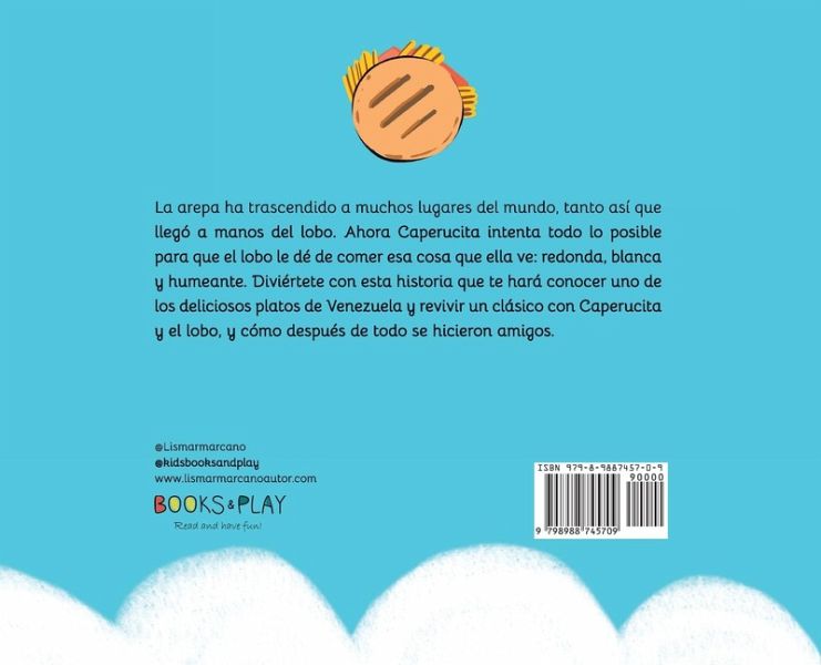 La Arepa ha trascendido a muchos lugares del mundo, tanto así que llegó a mano del lobo. Ahora Caperucita intenta todo lo posible, para que el lobo le dé de comer esa cosa que ella ve: redonda, blanca y humeante. Es un cuento sobre una de las comidas venezolanas más populares en el mundo. Sus protagonistas caperucita y el lobo, cuentan la historia de una manera amena y divertida, para que todo aquel que no haya probado la arepa venezolana se anime hacerlo. una historia desde las perspectiva del turista que conoce la arepa venezolana y luego no puede dejar de comerla. Además es una historia de amistad, de companerismo y de como a pesar de todas las diferencias entre el lobo y caperucita, llegaron a convertirse en grandes amigos. Para los ninos que están fuera de Venezuela será muy divertido poder leer y compartir esta historia con sus nuevos amigos e invitarlos a su casa, para hacer unas deliciosas arepas venezolanas. En el cuento se encuentra el Guacamayo Juancho y el loro Roberto, ambos venezolanos y se encargan de contar sobre las bondades de Venezuela a los habitantes del pueblo donde sucede esta linda historia. Disfruten de esta historia.