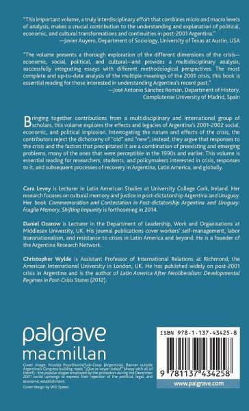 Foreword; Colin Lewis Introduction: Revisiting the Argentine Crisis a Decade on: Changes and Continuities?; Cara Levey, Daniel Ozarow, Christopher Wylde PART I: THE POLITICAL ECONOMY OF (POST) CRISIS ARGENTINA 1. Continuity and Change in the Interpretation of Upheaval: Re-examining the Argentine Crisis of 2001-02; Christopher Wylde, 2. Post-Convertibility Growth in Argentina: Long Term Dynamics and Limits, 1960-2008; Cecilia T. Lanata Briones and Rubén M. Lo Vuolo 3. Macro-economic Governance in Post-neoliberal Argentina and the Relentless Power of TNCs: The Case of the Soy Complex; Miguel A. Rivera Quiñones PART II: SOCIAL MOVEMENTS AND MASS MOBILISATION BEFORE, DURING AND AFTER QUE SE VAYAN TODOS 4.'It's the economy, stupid', Or is it? The Role of Political Crises in Mass Mobilisation: The Case of Argentina in 2001; Olga Onuch 5. Disagreement and Hope: the Hidden Transcripts in the Grammar of Political Recovery Post-crisis Argentina; Ana Cecilia Dinerstein 6. Argentina since 2001: From Spontaneous Uprising to 'transition', or a Crisis Intermezzo?; Heike Schaumberg 7. Revisiting Argentina 2001-2013: From 'Que se vayan todos! to the Peronist Decade; Maristella Svampa PART III: CULTURAL AND MEDIA RESPONSES TO THE 2001 CRISIS 8. Tropical Buenos Aires: Representations of Race in Argentine Literature during the 2001 Crisis and Aftermath; Ignacio Aguiló 9. D esalambrando el aire: Communication and Indigenous Struggles in Post-crisis Patagonia; Saskia Fischer 10. Assembling the Past, Performing the Nation: The Argentine Bicentenary and Regaining of Public Space in the Aftermath of the 2001 Crisis; Cecilia Dinardi Afterword; Ezequiel Adamovsky