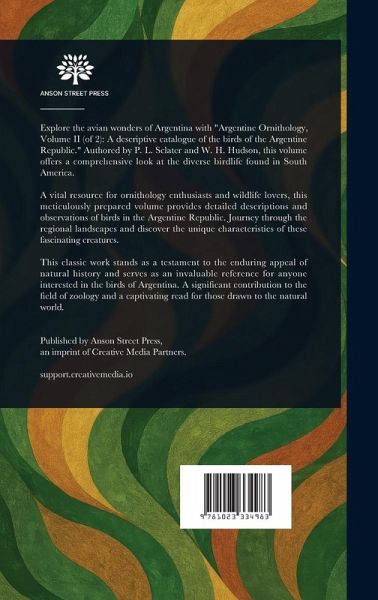 Explore the avian wonders of Argentina with "Argentine Ornithology, Volume II (of 2): A descriptive catalogue of the birds of the Argentine Republic." Authored by P. L. Sclater and W. H. Hudson, this volume offers a comprehensive look at the diverse birdlife found in South America. A vital resource for ornithology enthusiasts and wildlife lovers, this meticulously prepared volume provides detailed descriptions and observations of birds in the Argentine Republic. Journey through the regional landscapes and discover the unique characteristics of these fascinating creatures. This classic work stands as a testament to the enduring appeal of natural history and serves as an invaluable reference for anyone interested in the birds of Argentina. A significant contribution to the field of zoology and a captivating read for those drawn to the natural world. This work has been selected by scholars as being culturally important, and is part of the knowledge base of civilization as we know it. This work is in the public domain in the United States of America, and possibly other nations. Within the United States, you may freely copy and distribute this work, as no entity (individual or corporate) has a copyright on the body of the work. Scholars believe, and we concur, that this work is important enough to be preserved, reproduced, and made generally available to the public. We appreciate your support of the preservation process, and thank you for being an important part of keeping this knowledge alive and relevant.