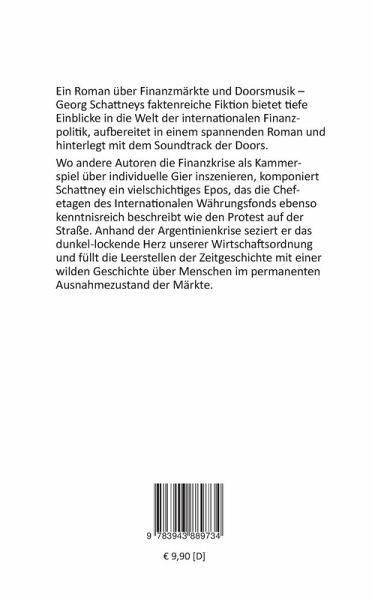 Ein Roman über Finanzmärkte und Doorsmusik ¿ Georg Schattneys faktenreiche Fiktion bietet tiefe Einblicke in die Welt der internationalen Finanzpolitik, aufbereitet in einem spannenden Roman und hinterlegt mit dem Soundtrack der Doors. Wo andere Autoren die Finanzkrise als Kammerspiel über individuelle Gier inszenieren, komponiert Schattney ein vielschichtiges Epos, das die Chefetagen des Internationalen Währungsfonds ebenso kenntnisreich beschreibt wie den Protest auf der Straße. Anhand der Argentinienkrise seziert er das dunkel-lockende Herz unserer Wirtschaftsordnung und füllt die Leerstellen der Zeitgeschichte mit einer wilden Geschichte über Menschen im permanenten Ausnahmezustand der Märkte.