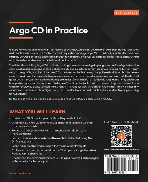 Build CD pipelines following GitOps principles like declarative and immutable changes stored in version control, all continuously reconciled by Argo CD, and minimize the failure of deployments. Purchase of the print or Kindle book includes a free eBook in the PDF format. Key Features:Discover how to apply GitOps principles to build real-world CD pipelines Understand Argo CD components and how they work together to reconcile cloud native applications Learn to run Argo CD in production with declarative config changes, security, observability, disaster recovery, and more Book Description: GitOps follows the practices of infrastructure as code (IaC), allowing developers to use their day-to-day tools and practices such as source control and pull requests to manage apps. With this book, you'll understand how to apply GitOps bootstrap clusters in a repeatable manner, build CD pipelines for cloud-native apps running on Kubernetes, and minimize the failure of deployments. You'll start by installing Argo CD in a cluster, setting up user access using single sign-on, performing declarative configuration changes, and enabling observability and disaster recovery. Once you have a production-ready setup of Argo CD, you'll explore how CD pipelines can be built using the pull method, how that increases security, and how the reconciliation process occurs when multi-cluster scenarios are involved. Next, you'll go through the common troubleshooting scenarios, from installation to day-to-day operations, and learn how performance can be improved. Later, you'll explore the tools that can be used to parse the YAML you write for deploying apps. You can then check if it is valid for new versions of Kubernetes, verify if it has any security or compliance misconfigurations, and that it follows the best practices for cloud-native apps running on Kubernetes. By the end of this book, you'll be able to build a real-world CD pipeline using Argo CD. What You Will Learn:Understand GitOps principles and how they relate to IaC Discover how Argo CD lays the foundation for reconciling Git state with the cluster state Run Argo CD in production with an emphasis on reliability and troubleshooting Bootstrap Kubernetes clusters with essential utilities following the GitOps approach Set up a CD pipeline and minimize the failure of deployments Explore ways to verify and validate the YAML you put together when working with Kubernetes Understand the democratization of GitOps and how the GitOps engine will enable its further adoption Who this book is for: If you're a software developer, DevOps engineer, or SRE who is responsible for building CD pipelines for projects running on Kubernetes and wants to advance in your career, this book is for you. Basic knowledge of Kubernetes, Helm, or Kustomize and CD pipelines will help you to get the most out of this book.