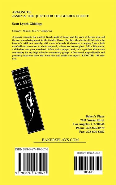 Jason & the Quest for the Golden Fleece, A Comedy of Tragic Proportions / 10-15m, 13-17f / Simple set / Running time: 105 minutes Argonuts recounts the ancient Greek myth of Jason and his crew of heroes who sail the seas on a daring quest for the Golden Fleece. But here the classic old tale takes the form of a wild new comedy, with a cast of nearly 40 characters ranging from a half-man/half-horse centaur to a hot-tempered yet insecure bronze giant. Add a little music, a slideshow and your stand