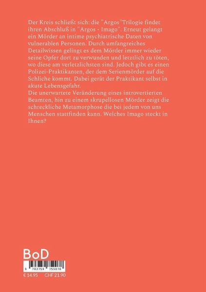 Der Kreis schließt sich: die "Argos"Trilogie findet ihren Abschluß in "Argos - Imago". Erneut gelangt ein Mörder an intime psychiatrische Daten von vulnerablen Personen. Durch umfangreiches Detailwissen gelingt es dem Mörder immer wieder seine Opfer dort zu verwunden und letztlich zu töten, wo diese am verletzlichsten sind. Jedoch gibt es einen Polizei-Praktikanten, der dem Serienmörder auf die Schliche kommt. Dabei gerät der Praktikant selbst in akute Lebensgefahr. Die unerwartete Veränderung eines introvertierten Beamten, hin zu einem skrupellosen Mörder zeigt die schreckliche Metamorphose die bei jedem von uns Menschen stattfinden kann. Welches Imago steckt in Ihnen?