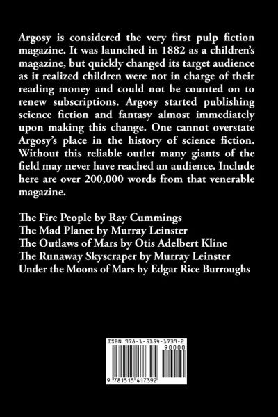 Argosy is considered the very first pulp fiction magazine. It was launched in 1882 as a children's magazine, but quickly changed its target audience as it realized children were not in charge of their reading money and could not be counted on to renew subscriptions. Argosy started publishing science fiction and fantasy almost immediately upon making this change. One cannot overstate Argosy's place in the history of science fiction. Without this reliable outlet many giants of the field may never have reached an audience. Include here are over 200,000 words from that venerable magazine. The Fire People by Ray Cummings The Mad Planet by Murray Leinster The Outlaws of Mars by Otis Adelbert Kline The Runaway Skyscraper by Murray Leinster Under the Moons of Mars by Edgar Rice Burroughs