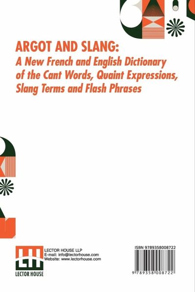 NEW PRINT WITH PROFESSIONAL TYPE-SET IN CONTRAST TO SCANNED PRINTS OFFERED BY OTHERS Argot And Slang: A New French And English Dictionary Of The Cant Words, Quaint Expressions, Slang Terms And Flash Phrases Used In The High And Low Life Of Old And New Paris This book is a result of an effort made by us towards making a contribution to the preservation and repair of original classic literature. In an attempt to preserve, improve and recreate the original content, we have worked towards: 1. Type-setting & Reformatting: The complete work has been re-designed via professional layout, formatting and type-setting tools to re-create the same edition with rich typography, graphics, high quality images, and table elements, giving our readers the feel of holding a fresh and newly reprinted and/or revised edition, as opposed to other scanned & printed (Optical Character Recognition - OCR) reproductions. 2. Correction of imperfections: As the work was re-created from the scratch, therefore, it was vetted to rectify certain conventional norms with regard to typographical mistakes, hyphenations, punctuations, blurred images, missing content/pages, and/or other related subject matters, upon our consideration. Every attempt was made to rectify the imperfections related to omitted constructs in the original edition via other references. However, a few of such imperfections which could not be rectified due to intentional\unintentional omission of content in the original edition, were inherited and preserved from the original work to maintain the authenticity and construct, relevant to the work.
