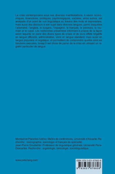 La crise contemporaine sous ses diverses manifestations, à savoir économiques, financières, politiques, psychologiques, sociales, entre autres, est analysée d'un point de vue linguistique au travers des mots et expressions, mais aussi des discours à son sujet dans diverses langues, parmi lesquelles l'allemand, l'anglais, le bulgare, l'espagnol, le français, le polonais, le roumain et le russe. Les recherches présentées informent à propos de la façon, selon laquelle on parle des divers types de crises et de leurs effets négatifs en langue officielle, administrative, voire en langue standard, mais aussi en langue populaire et argotique, et permettent de comprendre quelles sont les fonctions exercées, lorsqu'il est choisi de parler de la crise en utilisant un registre particulier de langue.