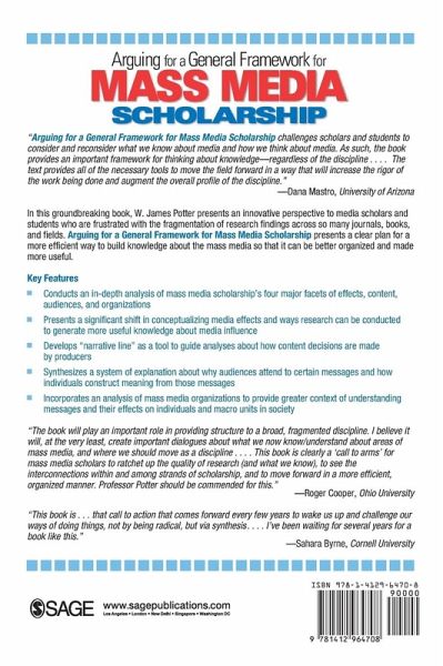 "Arguing for a General Framework for Mass Media Scholarship challenges scholars and students to consider and reconsider what we know about media and how we think about media. As such, the book provides an important framework for thinking about knowledge-regardless of the discipline... The text provides all of the necessary tools to move the field forward in a way that will increase the rigor of the work being done and augment the overall profile of the discipline." -Dana Mastro, University of Arizona In this groundbreaking book, W. James Potter presents an innovative perspective to media scholars and students who are frustrated with the fragmentation of research findings across so many journals, books, and fields. Arguing for a General Framework for Mass Media Scholarship presents a clear plan for a more efficient way to build knowledge about the mass media so that it can be better organized and made more useful. Key Features Conducts an in-depth analysis of mass media scholarship's four major facets of effects, content, audiences, and organizations Presents a significant shift in conceptualizing media effects and ways research can be conducted to generate more useful knowledge about media influence Develops "narrative line" as a tool to guide analyses about how content decisions are made by producers Synthesizes a system of explanation about why audiences attend to certain messages and how individuals construct meaning from those messages Incorporates an analysis of mass media organizations to provide greater context of understanding messages and their effects on individuals and macro units in society "The book will play an important role in providing structure to a broad, fragmented discipline. I believe it will, at the very least, create important dialogues about what we now know/understand about areas of mass media, and where we should move as a discipline... This book is clearly a 'call to arms' for mass media scholars to ratchet up the quality of research (and what we know), to see the interconnections within and among strands of scholarship, and to move forward in a more efficient, organized manner. Professor Potter should be commended for this." -Roger Cooper, Ohio University "This book is...that call to action that comes forward every few years, to wake us up and challenge our ways of doing things, not by being radical, but via synthesis... I've been waiting for several years for a book like this." -Sahara Byrne, Cornell University