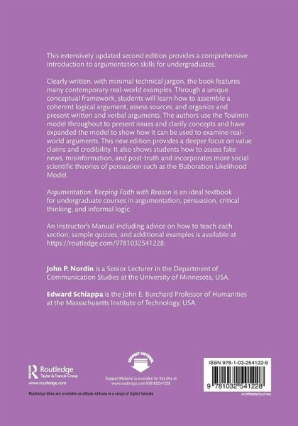Clearly written, with minimal technical jargon, the book features many contemporary real-world examples. Through a unique conceptual framework, students will learn how to assemble a coherent logical argument, assess sources, and organize and present written and verbal arguments. The authors use the Toulmin model throughout to present issues and clarify concepts and have expanded the model to show how it can be used to examine real-world arguments. This new edition provides a deeper focus on value claims and credibility. It also shows students how to assess fake news, misinformation, and post-truth and incorporates more social scientific theories of persuasion such as the Elaboration Likelihood Model.