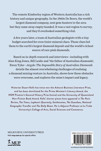 The remote Kimberley region of Western Australia has a rich history and unique geography. In the 1960s De Beers, the world's largest diamond company, sent gem-hunters to the area but they came away empty-handed. It was a vast region to survey, and they'd overlooked something vital. A few years later, a team of Australian geologists with a tiny budget searched for even tinier mineral clues. Those clues led them to the earth's largest diamond deposit and the world's richest source of rare pink diamonds. Based on in-depth research and interviews-including with Alan King Jones, Bill Leslie and 'the father of Australian diamonds', Ewen Tyler-Argyle: The Impossible Story of Australian Diamonds details the almost overwhelming challenges with realising a diamond mining venture in Australia, shows how these obstacles were overcome, and explores the mine's impact and legacy.