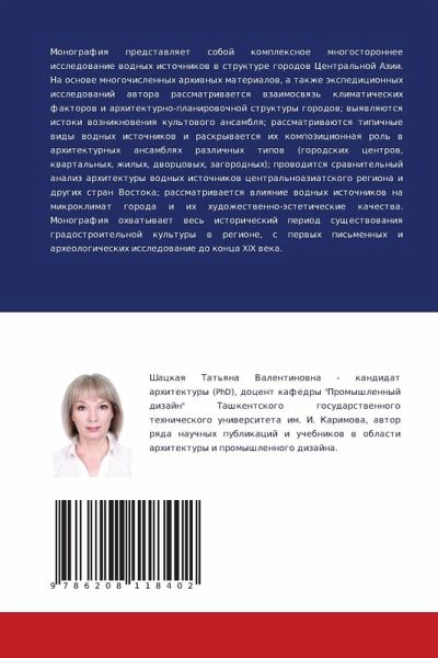 Monografiq predstawlqet soboj komplexnoe mnogostoronnee issledowanie wodnyh istochnikow w strukture gorodow Central'noj Azii. Na osnowe mnogochislennyh arhiwnyh materialow, a takzhe äxpedicionnyh issledowanij awtora rassmatriwaetsq wzaimoswqz' klimaticheskih faktorow i arhitekturno-planirowochnoj struktury gorodow; wyqwlqütsq istoki wozniknoweniq kul'towogo ansamblq; rassmatriwaütsq tipichnye widy wodnyh istochnikow i raskrywaetsq ih kompozicionnaq rol' w arhitekturnyh ansamblqh razlichnyh tipow (gorodskih centrow, kwartal'nyh, zhilyh, dworcowyh, zagorodnyh); prowoditsq srawnitel'nyj analiz arhitektury wodnyh istochnikow central'noaziatskogo regiona i drugih stran Vostoka; rassmatriwaetsq wliqnie wodnyh istochnikow na mikroklimat goroda i ih hudozhestwenno-ästeticheskie kachestwa. Monografiq ohwatywaet wes' istoricheskij period suschestwowaniq gradostroitel'noj kul'tury w regione, s perwyh pis'mennyh i arheologicheskih issledowanie do konca XIX weka.