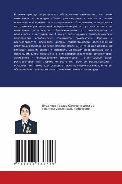 V knige priwodqtsq rezul'taty obsledowaniq tehnicheskogo sostoqniq pamqtnikow arhitektury g.Hiwy, rassmatriwaetsq analiz i raschet osnowaniq i fundamentow po rezul'tatam obsledowaniq, predlagaetsq metodicheskih rekomendacij po ukrepleniü, rekonstrukcii i restawracii pamqtnikow arhitektury, obespechiwaüschih ih dolgowechnost' i nadezhnost' w äxpluatacii. A takzhe analiziruütsq antisejsmicheskih meropriqtij istoricheskih pamqtnikow arhitektury Horezma i rassmatriwaetsq raschetnaq ocenka sejsmostojkosti obsledowannyh nekotoryh ob#ektow. Sdelana popytka izwlech' nechto obschee iz slozhnyh situacij drewnih wremen i stroitel'nyh prawil sformirowawshihsq w nastoqschem. Kniga prednaznachena inzhenerow-stroitelej, arhitektorow, aspirantow i prepodawatelej arhitekturno - stroitel'nyh wuzow, restawratorow pri razrabotke real'nyh proektow rekonstrukcii i usileniq pamqtnikow arhitektury, a takzhe nauchnymi organizaciqmi pri obsledowanii tehnicheskogo sostoqniq pamqtnikow arhitektury.