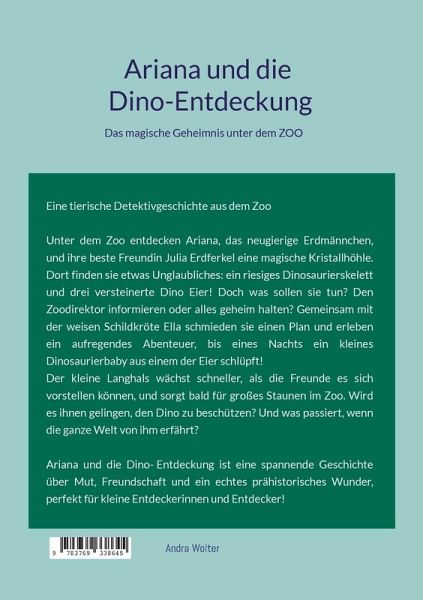 Eine tierische Detektivgeschichte aus dem Zoo Unter dem Zoo entdecken Ariana, das neugierige Erdmännchen, und ihre beste Freundin Julia Erdferkel eine magische Kristallhöhle. Dort finden sie etwas Unglaubliches: ein riesiges Dinosaurierskelett und drei versteinerte Dino Eier! Doch was sollen sie tun? Den Zoodirektor informieren oder alles geheim halten? Gemeinsam mit der weisen Schildkröte Ella schmieden sie einen Plan und erleben ein aufregendes Abenteuer, bis eines Nachts ein kleines Dinosaurierbaby aus einem der Eier schlüpft! Der kleine Langhals wächst schneller, als die Freunde es sich vorstellen können, und sorgt bald für großes Staunen im Zoo. Wird es ihnen gelingen, den Dino zu beschützen? Und was passiert, wenn die ganze Welt von ihm erfährt? Ariana und die Dino-Entdeckung ist eine spannende Geschichte über Mut, Freundschaft und ein echtes prähistorisches Wunder, perfekt für kleine Entdeckerinnen und Entdecker!
