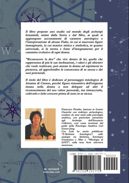 Il libro, alla sua seconda edizione, propone uno studio sul mondo degli archetipi femminili, attinti dalla Storia e dal Mito, ai quali si aggiunge l'interpretazione di alcune Fiabe, in cui si muovono figure immaginarie, la cui matrice simbolica si fa eterna e fonte d'insegnamento per il cammino evolutivo di ogni donna. "Riconoscere la dea interiore", quella che rappresenta di più le inclinazioni, i valori e gli obiettivi da realizzare può aiutare la donna ad esprimersi in pienezza e ad approfondire la conoscenza di sé stessa. Il titolo del libro è dedicato al personaggio mitologico di Arianna di Cnosso, figura riassuntiva dell'esigenza innata nella donna a non delegare ad altri il riconoscimento del suo valore personale, ma rintracciarlo, coltivarlo e farlo crescere prima di tutto in sé stessa. Con Lulu, l'autrice ha anche pubblicato "Dioniso e gli Altri", "Mitologia di LOST", "L'Alchimia Astrologica", "Plutone Alchemico" e "Gli Astri del Serial Killer". Francesca Piombo, conduce dal 2000 studi sulla Psicologia del Profondo. In qualità di simbolista ed astrologa umanistica, si occupa di archetipi mitologici ed alchemici, che ha illustrato su varie riviste specifiche e siti specializzati.