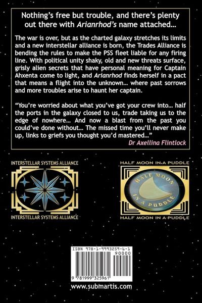 Arianrhod's Line is the third book in The Pirates' Web series. Nothing's free but trouble, and there's plenty out there with Arianrhod's name attached... The trading ship PSS Arianrhod, under her owner-captain Cinnabar Ahxenta, has to hold her own within an expanding charted galaxy of fluid political alliances, where changing Trades Alliance rules are forcing the PSS fleet into the firing line of any future conflict. Though the war that created chaos across the charted galaxy is over, hostiles are still out there spoiling for a fight, and with a newborn interstellar alliance calling the shots and sending out high-tech ships to explore beyond traditional zone boundaries, Arianrhod and her sister ships find themselves running afoul of home-grown as well as alien hazards. As underhand deals between alliance partners and greedy outside contractors to increase power and profits undermine political unity, old and new threats surface, and grisly alien secrets that have personal meaning for Captain Ahxenta amongst others, come to light. But trading across the charted galaxy brings surprises as well as dangers and some of those tie the mighty Private starship even closer to the aloof Captain Thal and his maverick Starfall fleet. With doors closing and trade tighter, Arianrhod finds herself in a pact that means a flight into the unknown... where past sorrows and more troubles arise to haunt her captain. "You're worried about what you've got your crew into... half the ports in the galaxy closed to us, trade taking us to the edge of nowhere... And now a blast from the past you could've done without... The missed time you'll never make up, links to griefs you thought you'd mastered." Dr Axellina Flintlock.