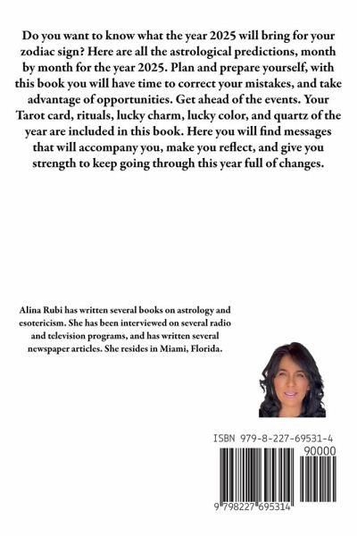 Do you want to know what the year 2025 will bring for your zodiac sign? Here are all the astrological predictions, month by month for the year 2025. Plan and prepare yourself, with this book you will have time to correct your mistakes, and take advantage of opportunities. Get ahead of the events. Your Tarot card, rituals, lucky charm, lucky color, and quartz of the year are included in this book. Here you will find messages that will accompany you, make you reflect, and give you strength to keep going through this year full of changes.