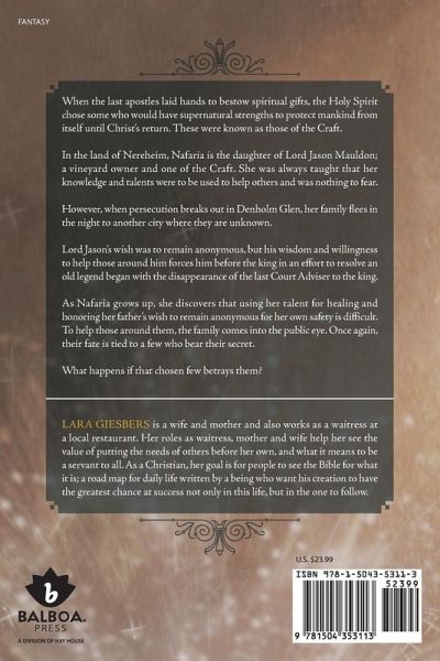 When the last apostles laid hands to bestow spiritual gifts, the Holy Spirit chose some who would have supernatural strengths to protect mankind from itself until Christ's return. These were known as those of the Craft. In the land of Nereheim, Nafaria is the daughter of Lord Jason Mauldon; a vineyard owner and one of the Craft. She was always taught that her knowledge and talents were to be used to help others and was nothing to fear. However, when persecution breaks out in Denholm Glen, her family flees in the night to another city where they are unknown. Lord Jason's wish was to remain anonymous, but his wisdom and willingness to help those around him forces him before the king in an effort to resolve an old legend began with the disappearance of the last Court Adviser to the king. As Nafaria grows up, she discovers that using her talent for healing and honoring her father's wish to remain anonymous for her own safety is difficult. To help those around them, the family comes into the public eye. Once again, their fate is tied to a few who bear their secret. What happens if that chosen few betrays them?
